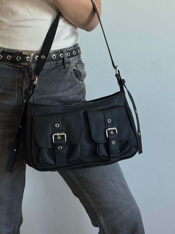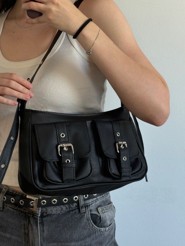 Material: ecocuero PU con forro interno, cierre ykk y herrajes plateados. Correa regulable para usar al hombro o cruzado.